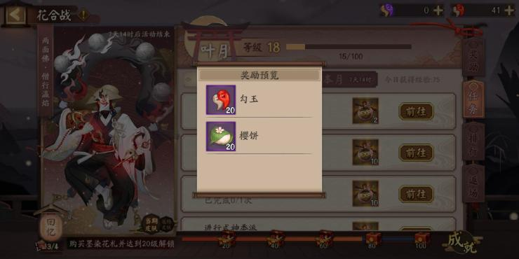 花合战每天的活跃度还是要打一打的,勾玉樱饼虽然只有20,但是积少成多不是嘛。