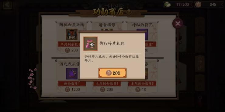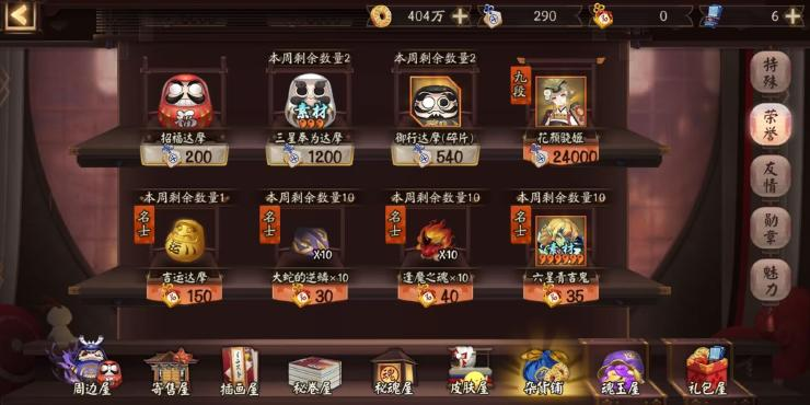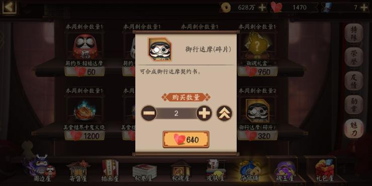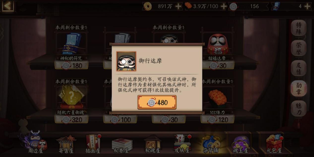 勋章商店每周一凌晨刷新,每次限购1个御行达摩。