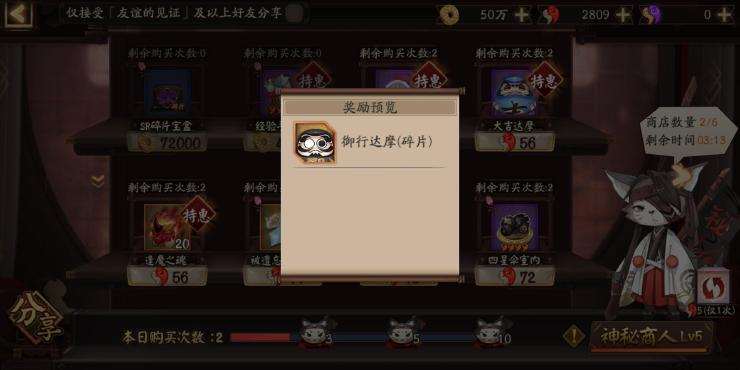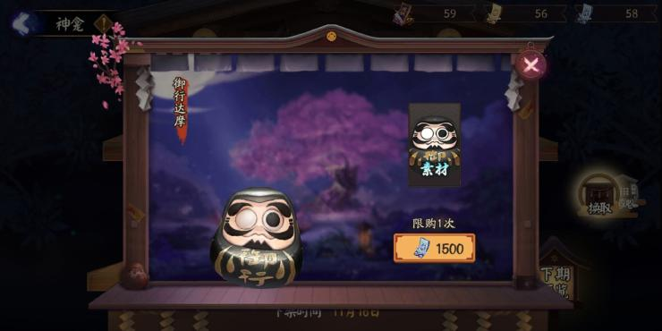 神龛商店差不多每两周刷新一次,每次限购1个御行达摩,一个月两个。