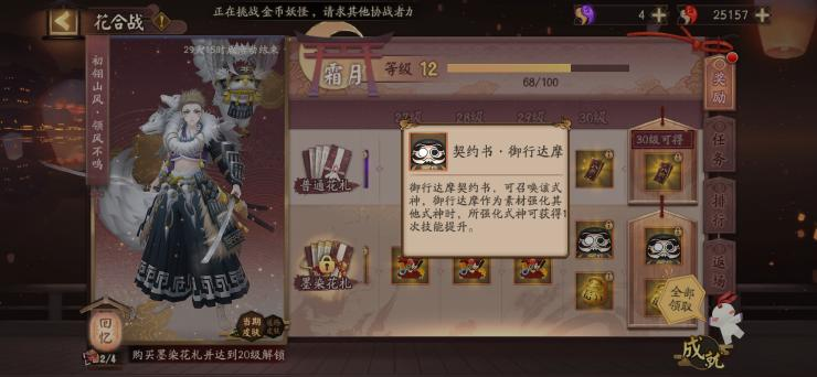 花合战每个月一个,30r解锁高级奖励,如果在本期打满了30级,可以获得下一期的打折券,只需要24r。