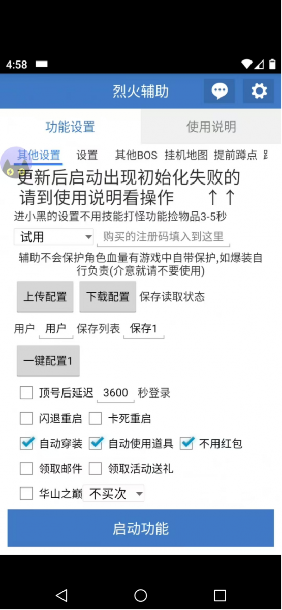 三、重启好后我们点击烈火辅助,在里面启动吗我们可以输入拿到的卡密(卡密可以在https://m.tb.cn/h.gruJAiDshEF4lbf这里购买),也可以直接点击登录试用一下。