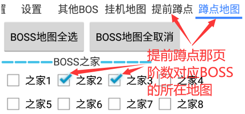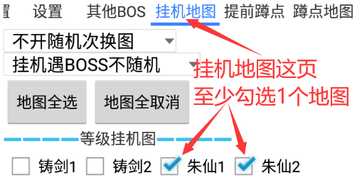 第2步:挂机地图这页至少选1个地图(打不打BOSS都得勾个地图,否则打完BOSS会站着不动)