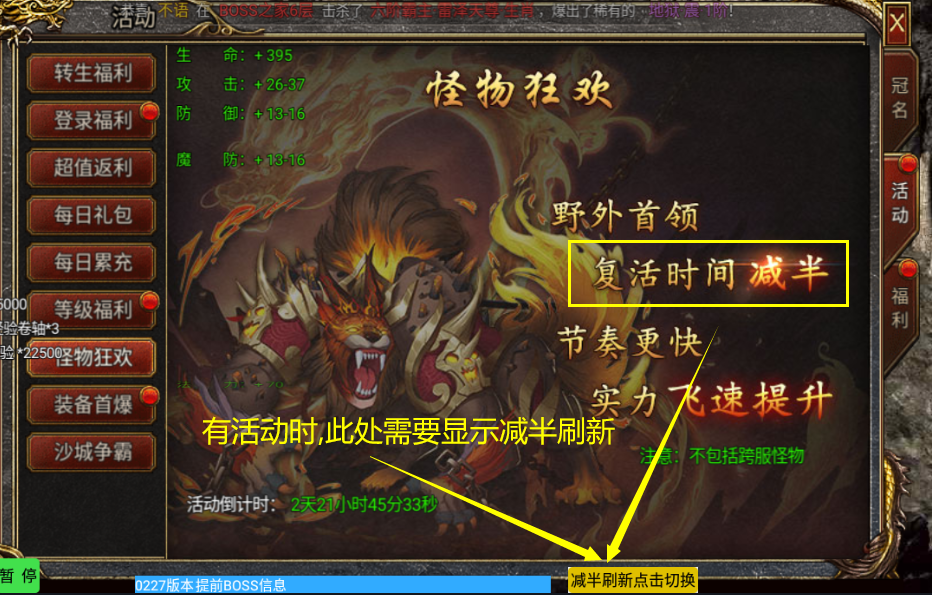 8、活动期间,复活时间减半,脚本提示“减半刷新”才有效,如果显示正常刷新,就点击切换,活动结束了,脚本提示点切换“正常刷新”就可以