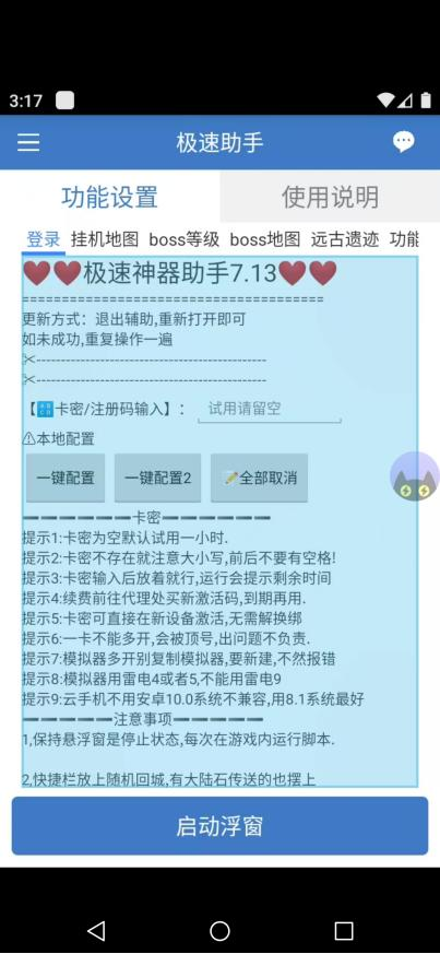 重启好后我们点击极速神器助手,在里面启动吗我们可以输入拿到的卡密(卡密可以在https://m.tb.cn/h.gruJAiDshEF4lbf这里购买),也可以直接点击登录试用一下。