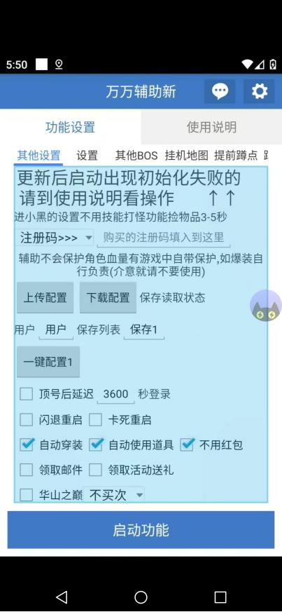 重启好后我们点击万万助手,在里面启动吗我们可以输入拿到的卡密(卡密可以在https://m.tb.cn/h.gruJAiDshEF4lbf这里购买),也可以直接点击登录试用一下,新手可以点击一键配置,自动配置新手设置,最后点击启动功能即可。需要操作其他的可以通过下面的设置再进行启动脚本。
