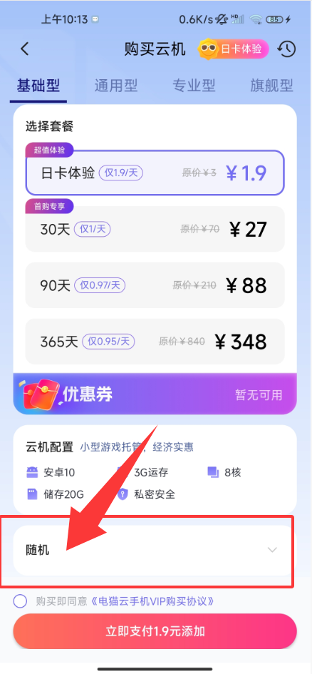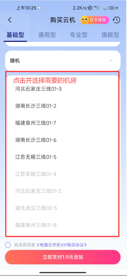 在选择并添加云机时,如下图点开【随机】,选择想要的云机机房即可。若未选择机房,云机机房则随机分配。